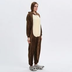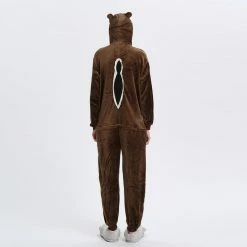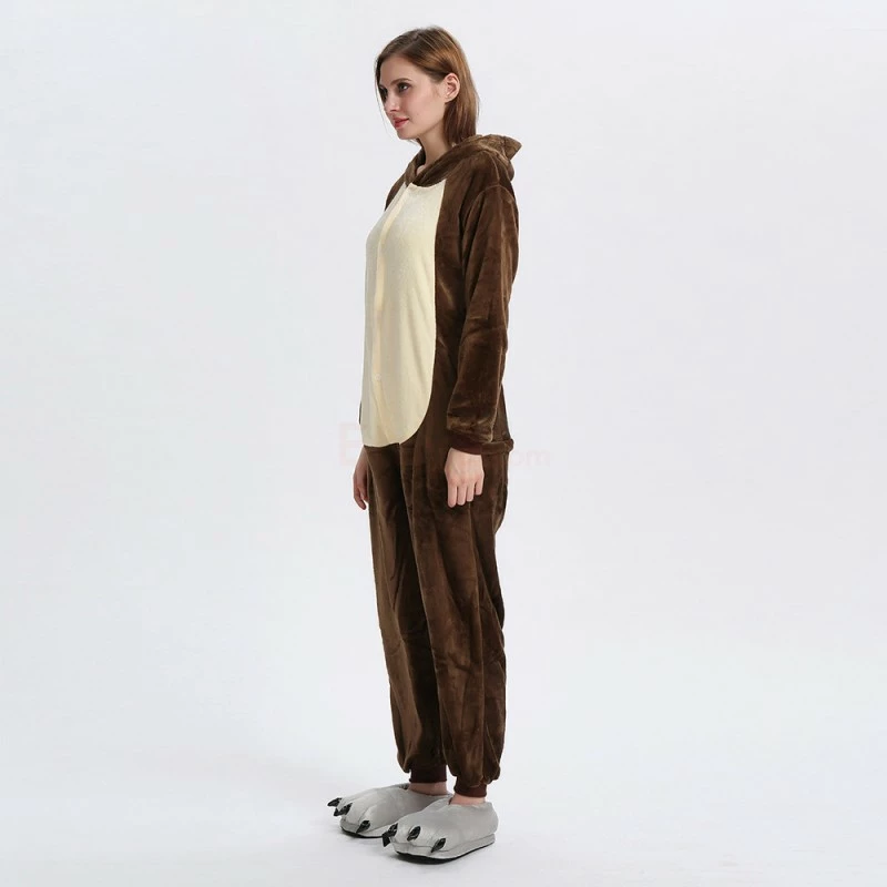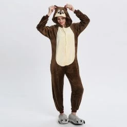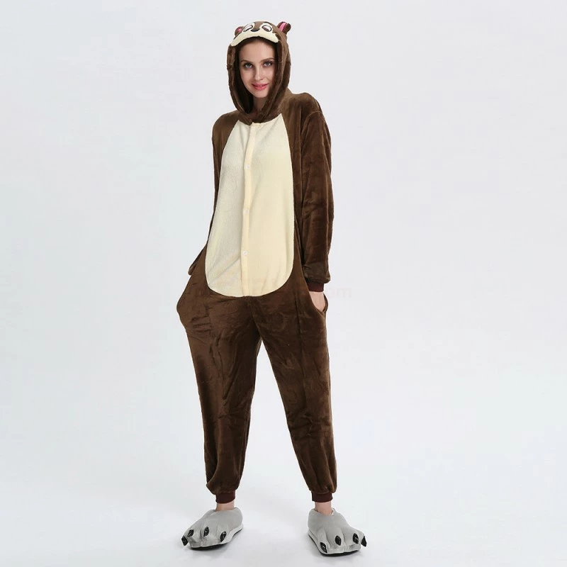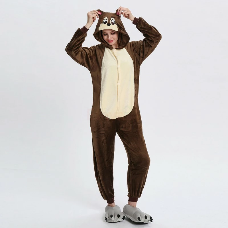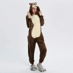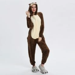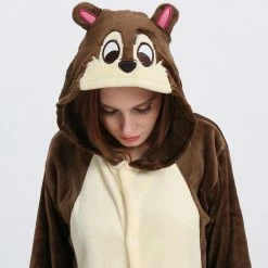 The chipmunk is a small striped rodent of the Sciuridae family. The tail length is close to the body length, the back hair is light yellow or orange red, and there are 5 dark brown vertical stripes, so it is called “five eyebrows”, The Chipmunk Kigurumi is dominated by maroon, with two pink ears, two large eyes and a black tail. It is also very flexible to wear on the body, and the warm and comfortable fabric is worth buying.