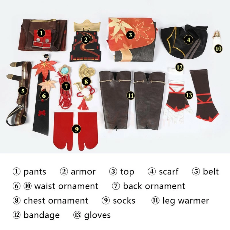 Full Set Including : Pants, Armor, Top, Scarf, Belt, Waist Ornament, Back Ornamet, Chest Ornament, Socks, Leg Warmer, Bandage, Gloves