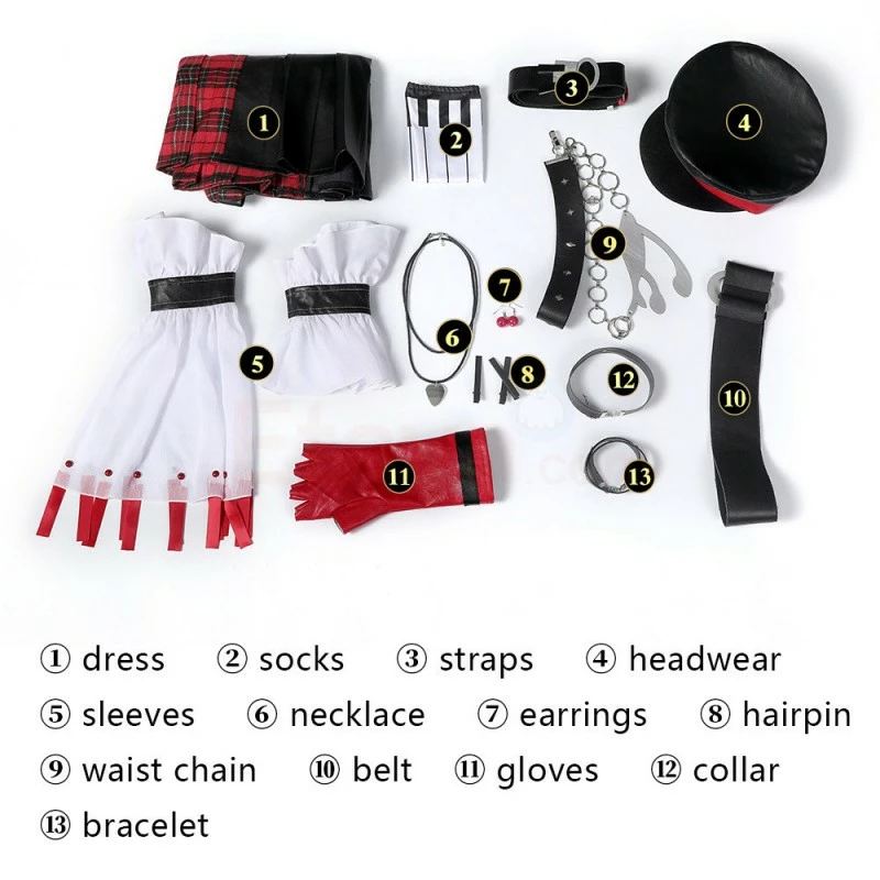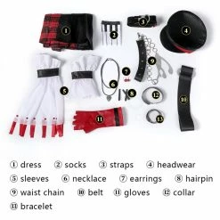 Full Set Including : Dress, Socks, Straps, Headwear, Sleeves, Necklace, Earrings, Hairpin, Waist Chain, Belt, Gloves, Collar, Bracelet.