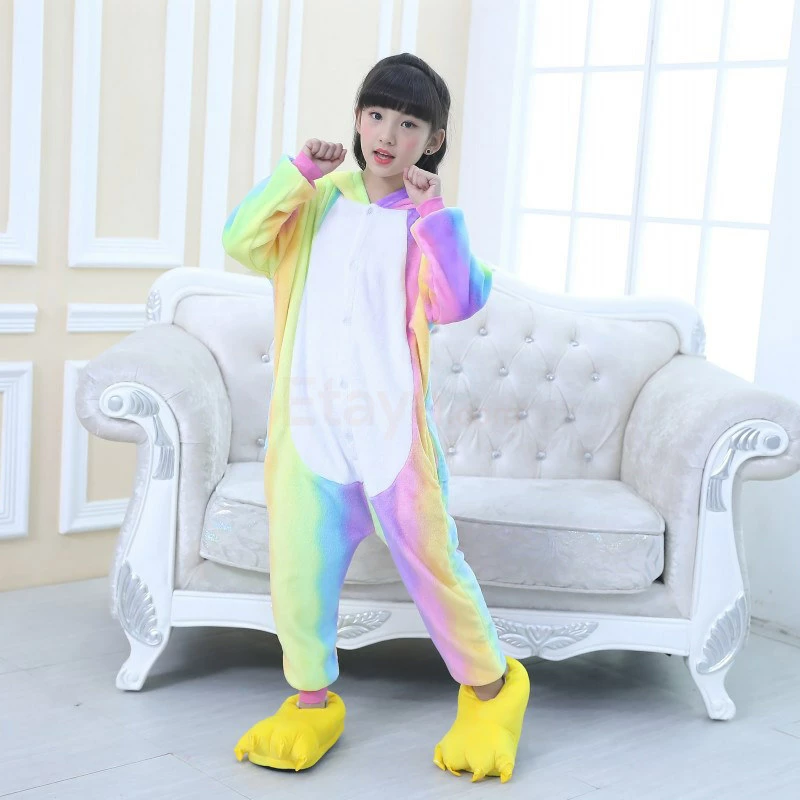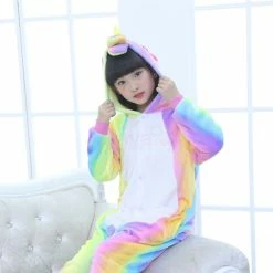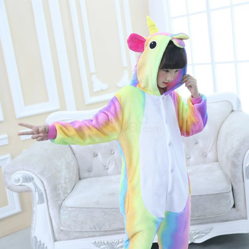 The unicorn is shaped like a white horse with a spiral angle in front of the forehead. The Kids Colorful Unicorn Kigurumi likes a variety of colors to mix and match very energetic children. Unicorn’s cartoon shape is very popular. The high-grade 100% Flannel and Fleece, high level of craftsmanship makes you buy it. Intimate pockets and zips are also very convenient.