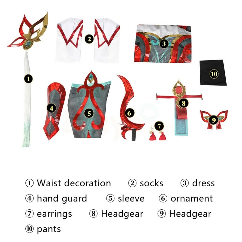 Full Set Including : Waist Decoration, Socks, Dress, Hand Guard, Sleeve, Ornament, Earrings, Headgear, Pants