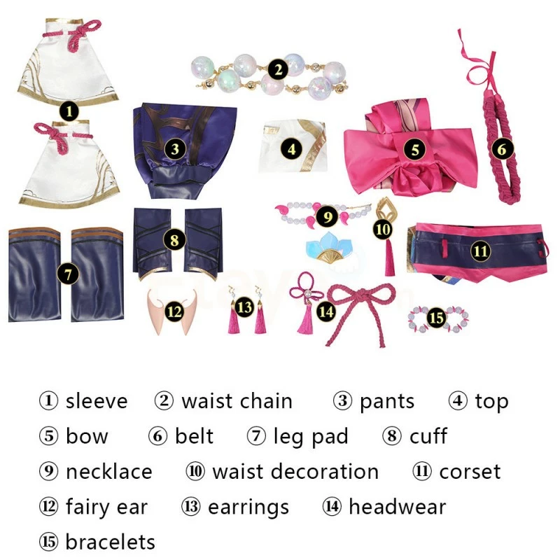 Full Set Including : Sleeve, Waist Chain, Pants, Top, Bow, Belt, Leg Pad, Cuff, Necklace, Waist Decoration, Corset, Fairy Ear, Earrings, Headwear, Bracelets