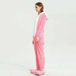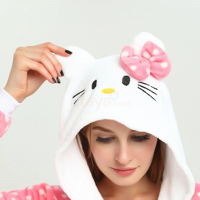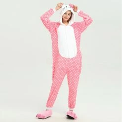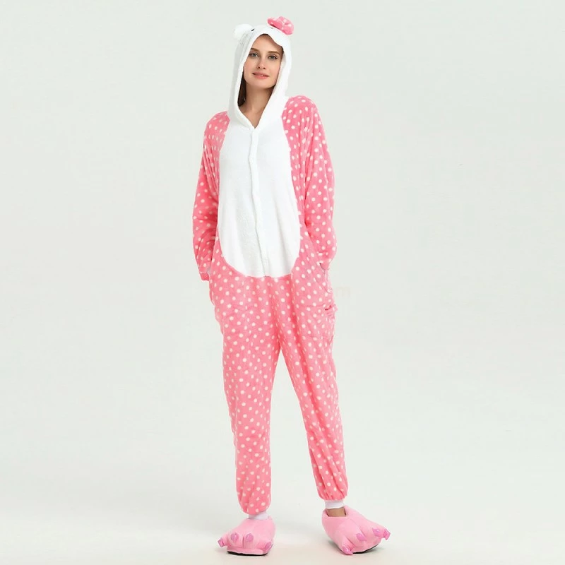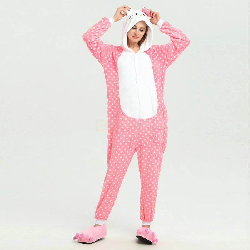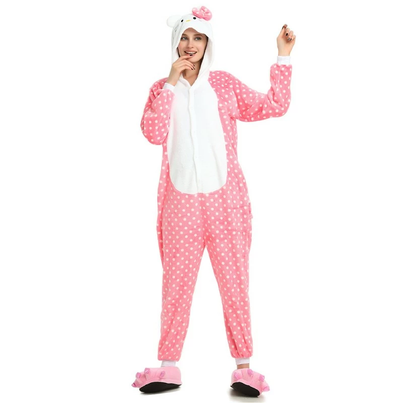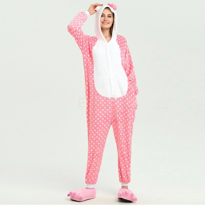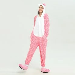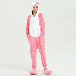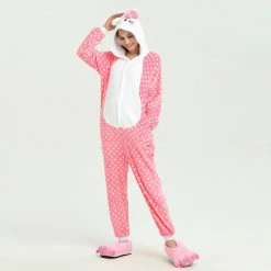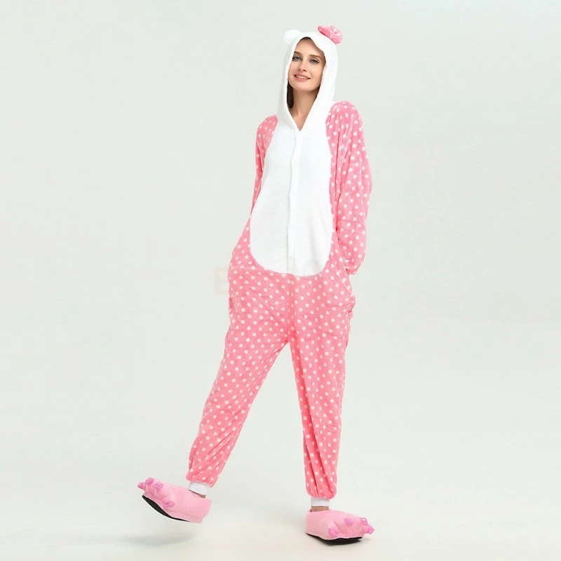 You will be kept warm by this soft fleece while Hello Kitty stands out with her traditional red Bow! High quality. Soft and comfortable. The charming Hello Kitty animal print with pink shoes is very cute. The Pink Dot Hello Kitty Kigurumi is the best choice for a home or party Let’s get started!