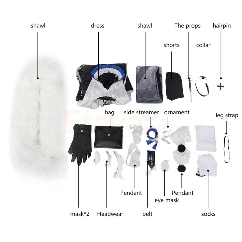 Full Set Including : Dress, Shorts, Shawl, Collar, Gloves, Hairpin, Headwear, Pendants, Belt, Bag, Ornament, Socks, Eye Mask, Side Streamer, Leg Strap, Other Props.