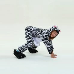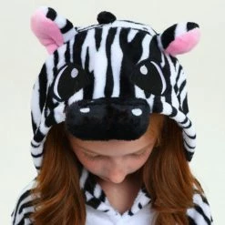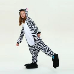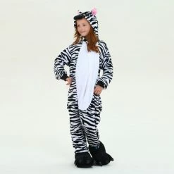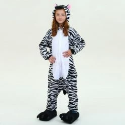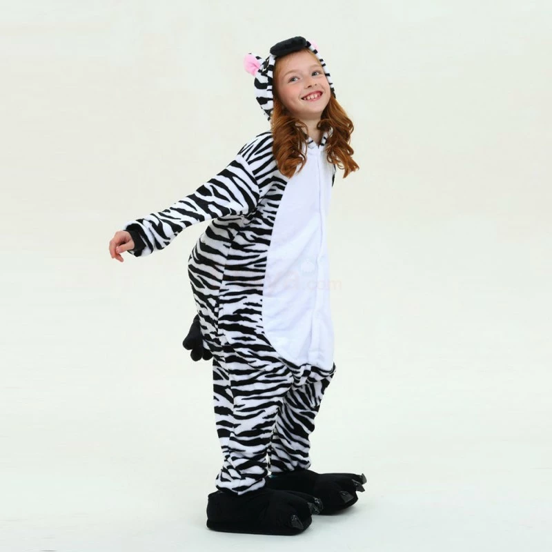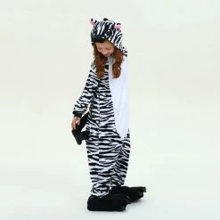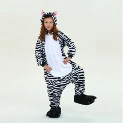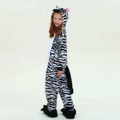 Zebras are several species of African equids united by their distinctive black-and-white striped coats. Their stripes come in different patterns, unique to each individual. The unique stripes of zebras make them one of the animals most familiar to people. The Kids Zebra Kigurumi With a zebra stripe pattern as the background, the belly is white, and the pink ears and black tail make the children cute and energetic.